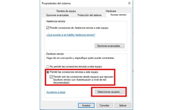 -Ahora se abre una nueva ventana. En la parte inferior hay que marcar dos opciones: «Permitir las conexiones remotas a este equipo» y «Permitir las conexiones desde equipos que ejecuten escritorio remoto con Autenticación a nivel de red».